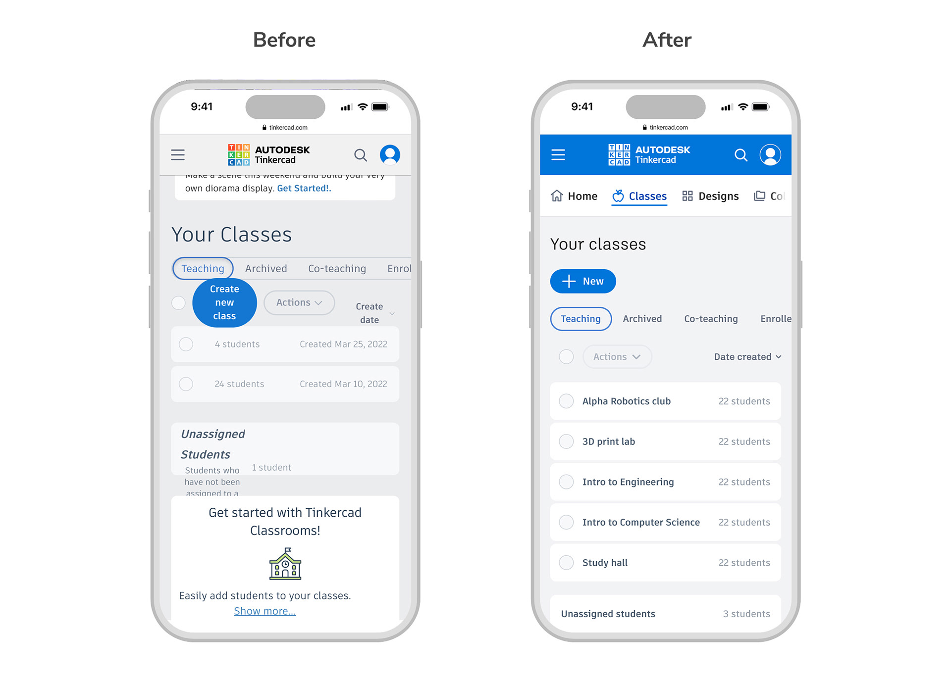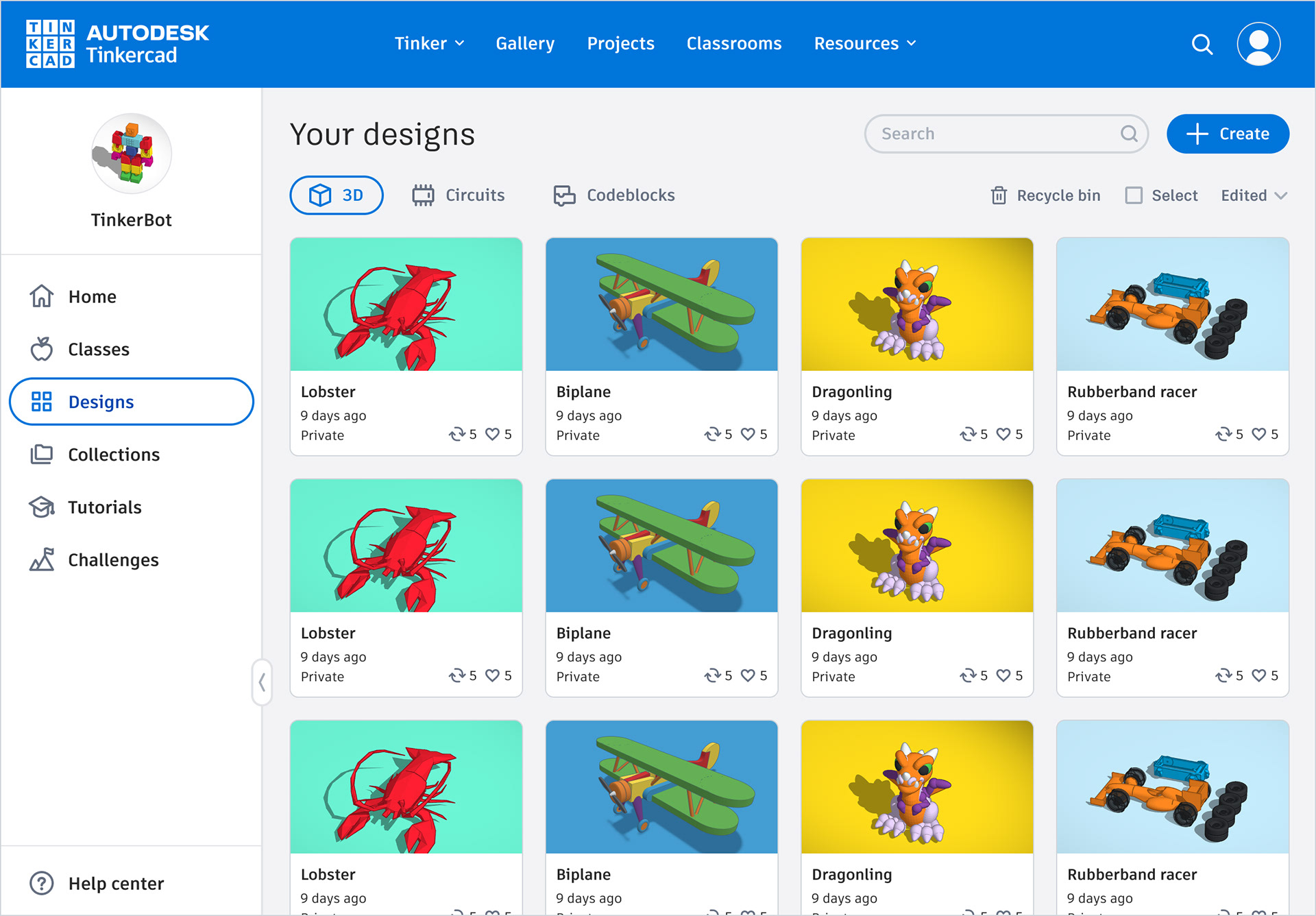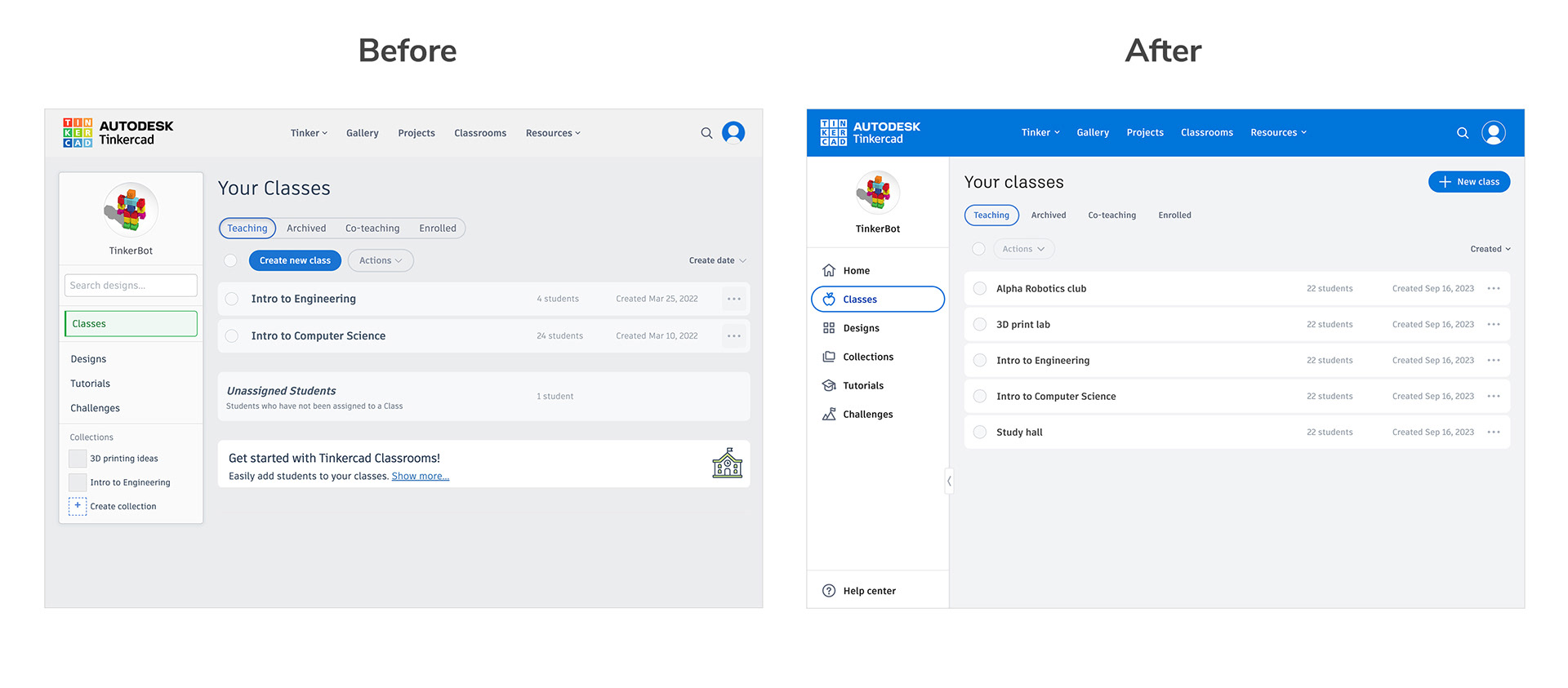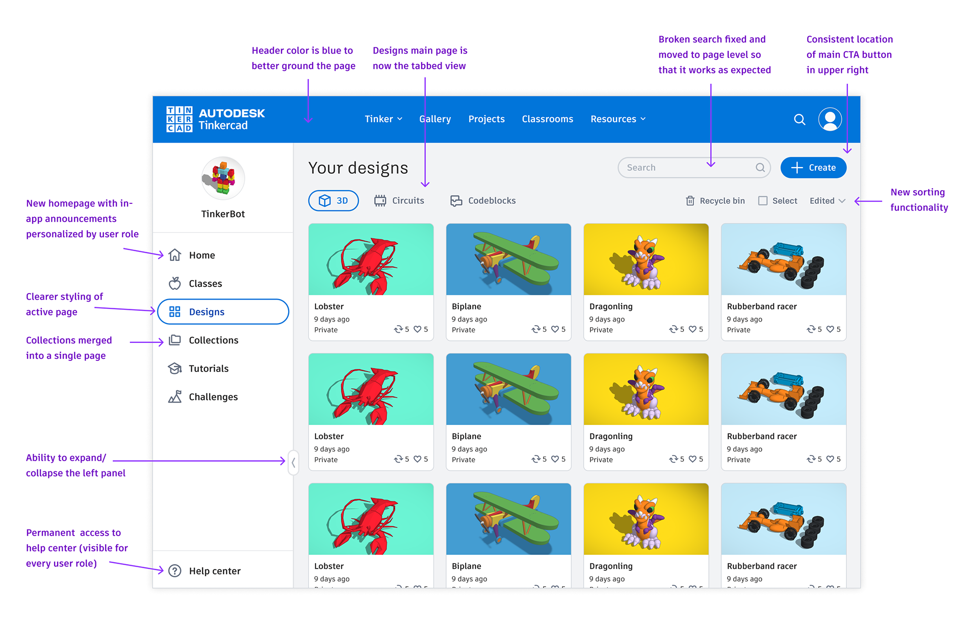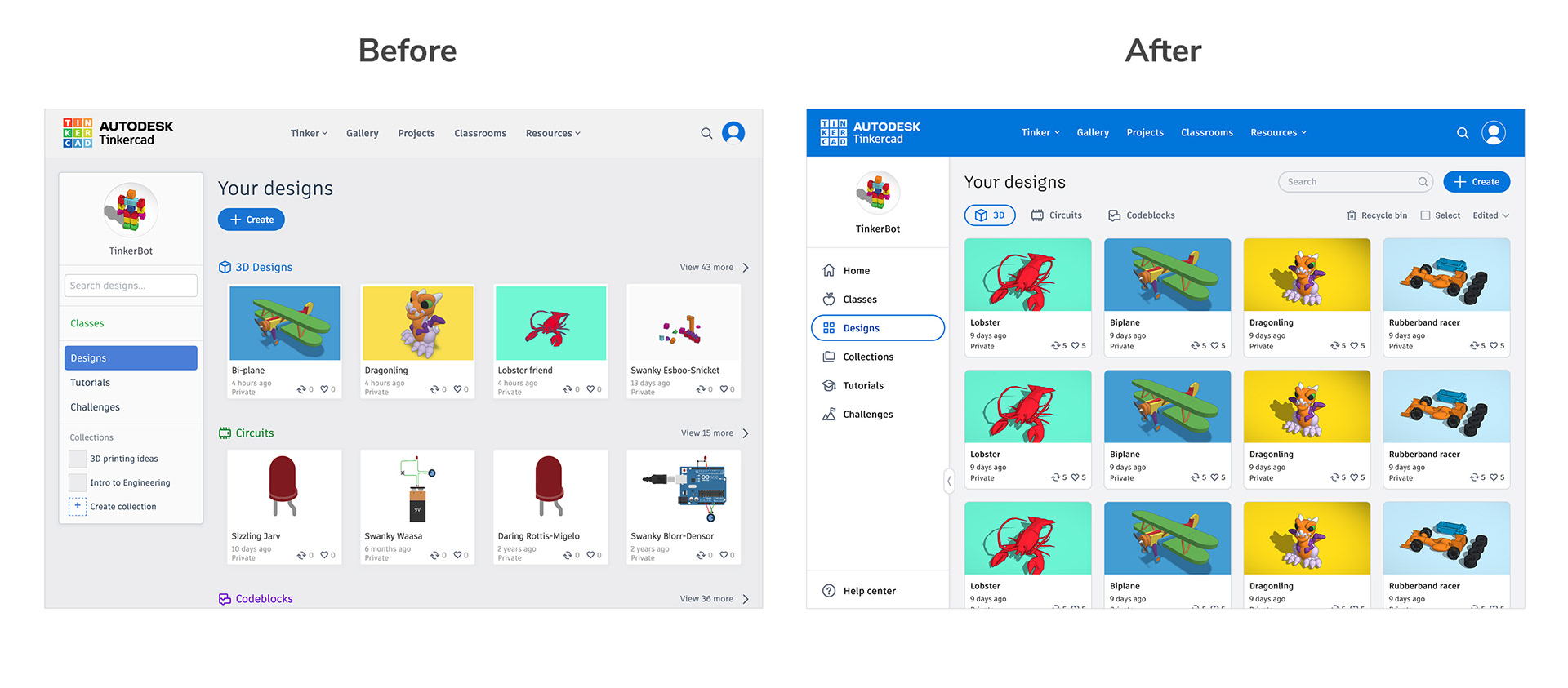 Tinkercad is a free app for 3D design, electronics, and coding used by millions of students and creative innovators worldwide. This project was a refresh of the logged in Tinkercad dashboard navigation to improve overall usability and functionality and align with new branding.